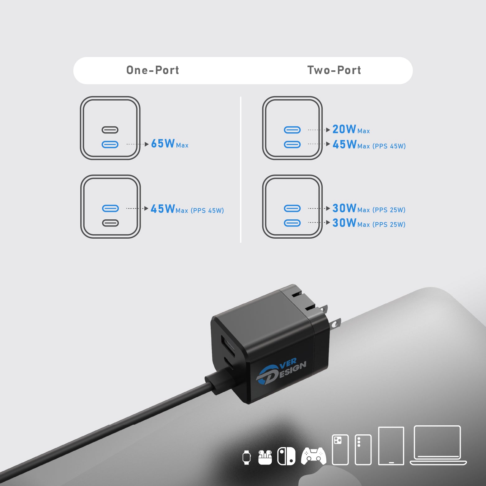 Dual-Port PD65W (PPS45W) Dual USB C Wall Charger