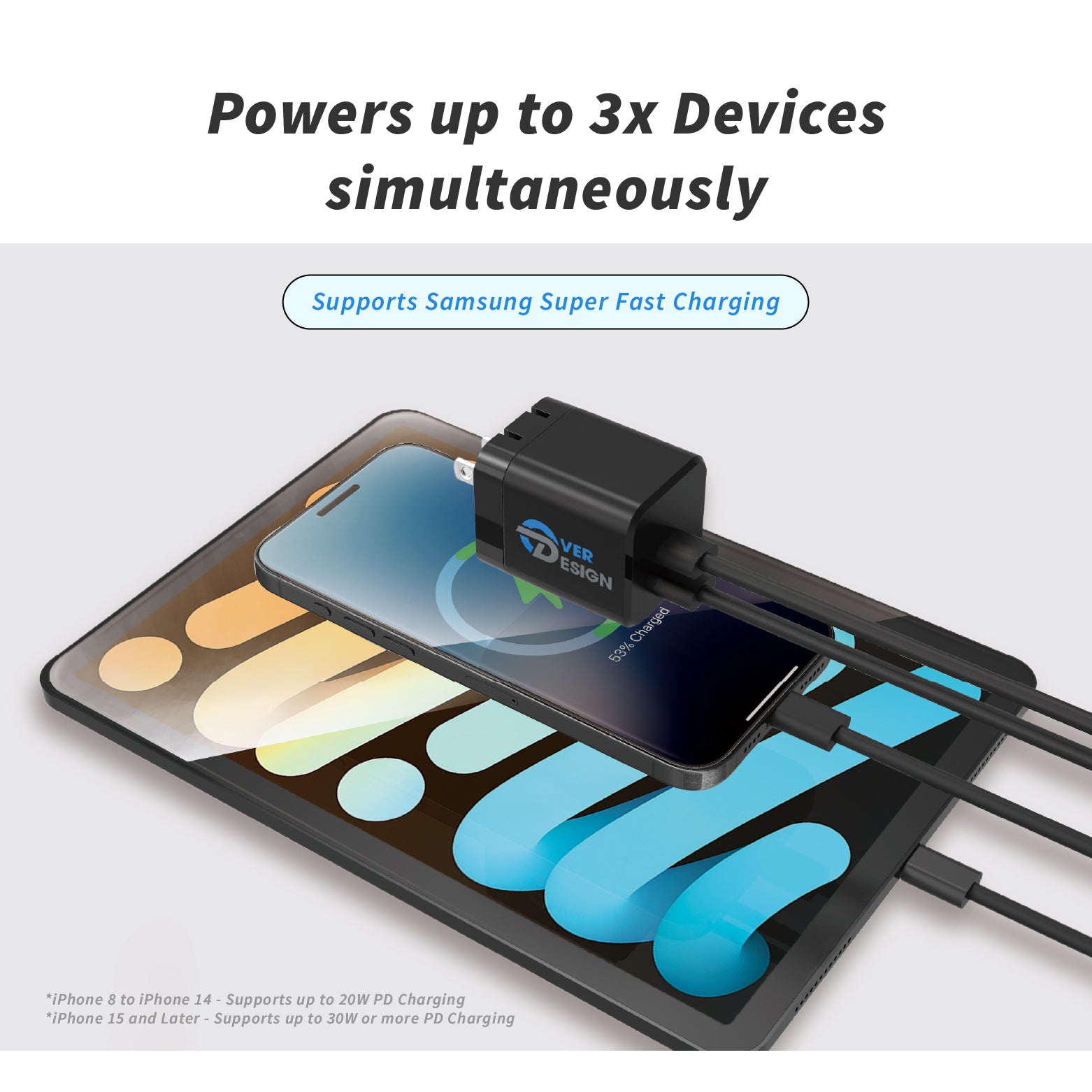 - Dual USB-C ports – Power two devices at the same time