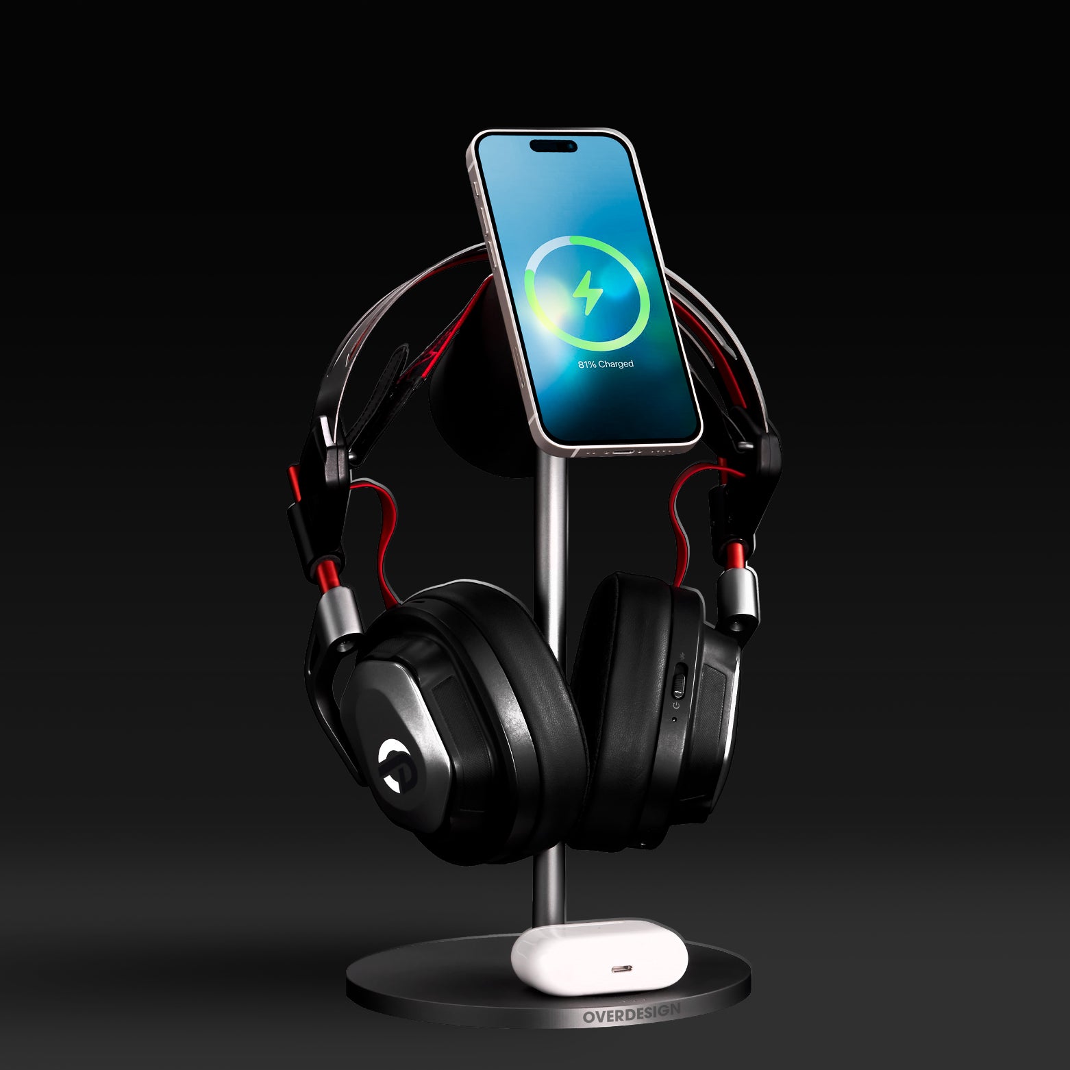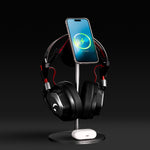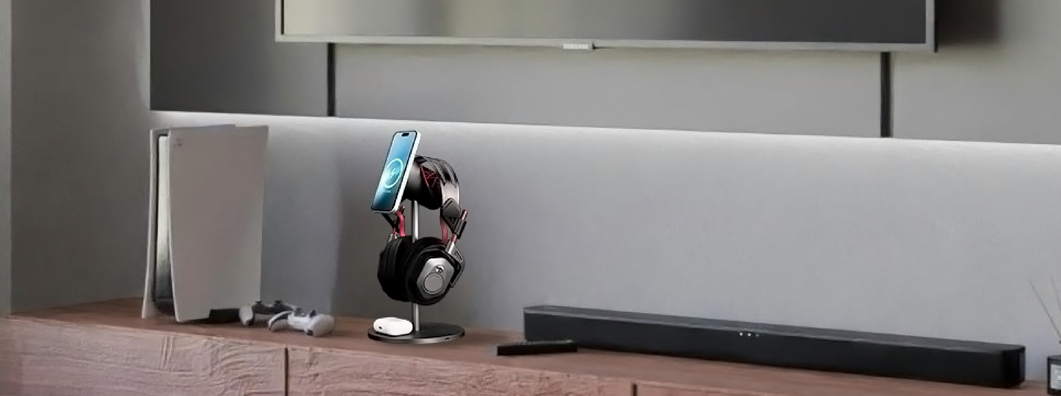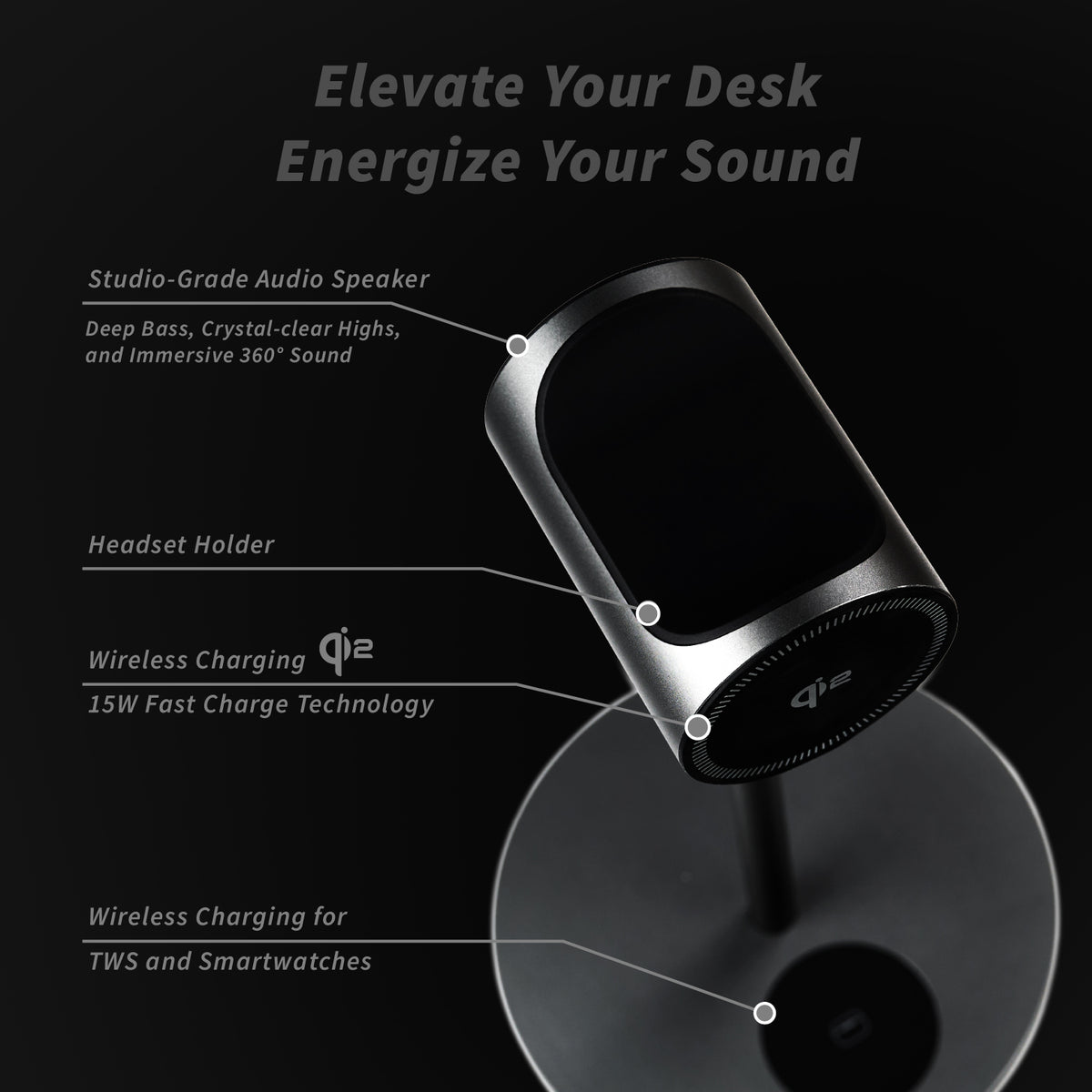 The SynthWave Dock delivers high-fidelity audio on par with top-tier brands, ensuring deep bass, crystal-clear highs, and immersive 360° sound. Suitable for modern workspaces and gaming setups, it doubles as a Qi2 wireless charging station, effortlessly powering smartphones, TWS earbuds, and smartwatches—all in one sleek, compact form. Plus, it's integrated headset stand keeps your headphones neatly stored, always within reach.